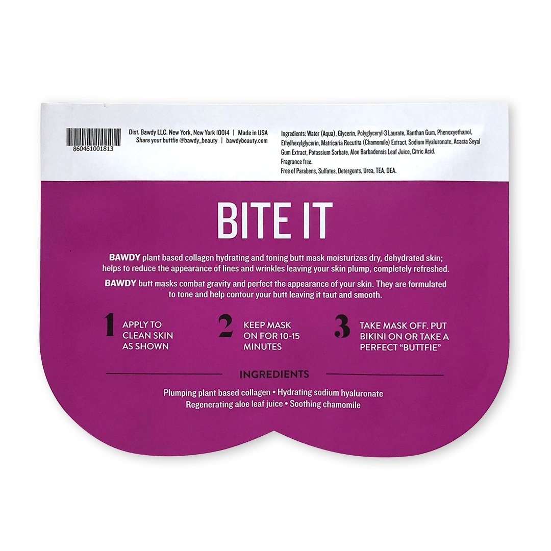 Bite It - Hydrating + Toning Plant Based Collagen Butt Mask: helps combat gravity and perfect the appearance of your skin. It is formulated to tone and help contour your butt leaving it taut and smooth while moisturizing dry, dehydrated skin. Bite It helps to reduce the appearance of lines and wrinkles leaving your skin plump and completely refreshed.